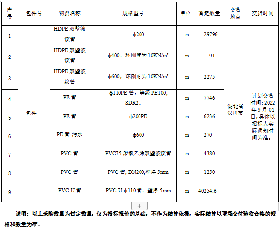 1.2 招標內容:本次管材采購招標內容詳見下表。