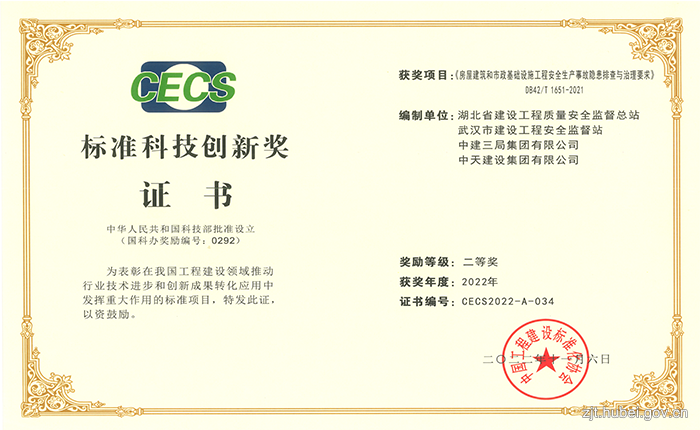 2023年2月28日,由中國工程建設(shè)標(biāo)準(zhǔn)化協(xié)會舉辦的2022年度標(biāo)準(zhǔn)科技創(chuàng)新獎頒獎典禮在京舉行。湖北省建設(shè)工程質(zhì)量安全監(jiān)督總站會同武漢市建設(shè)工程安全監(jiān)督站、中建三局集團(tuán)有限公司、中天建設(shè)集團(tuán)有限公司等單位編制的《房屋建筑和市政基礎(chǔ)設(shè)施工程安全生產(chǎn)事故隱患排查與治理要求》(DB42/T 1651-2021)獲得“標(biāo)準(zhǔn)科技創(chuàng)新獎”項(xiàng)目獎二等獎。